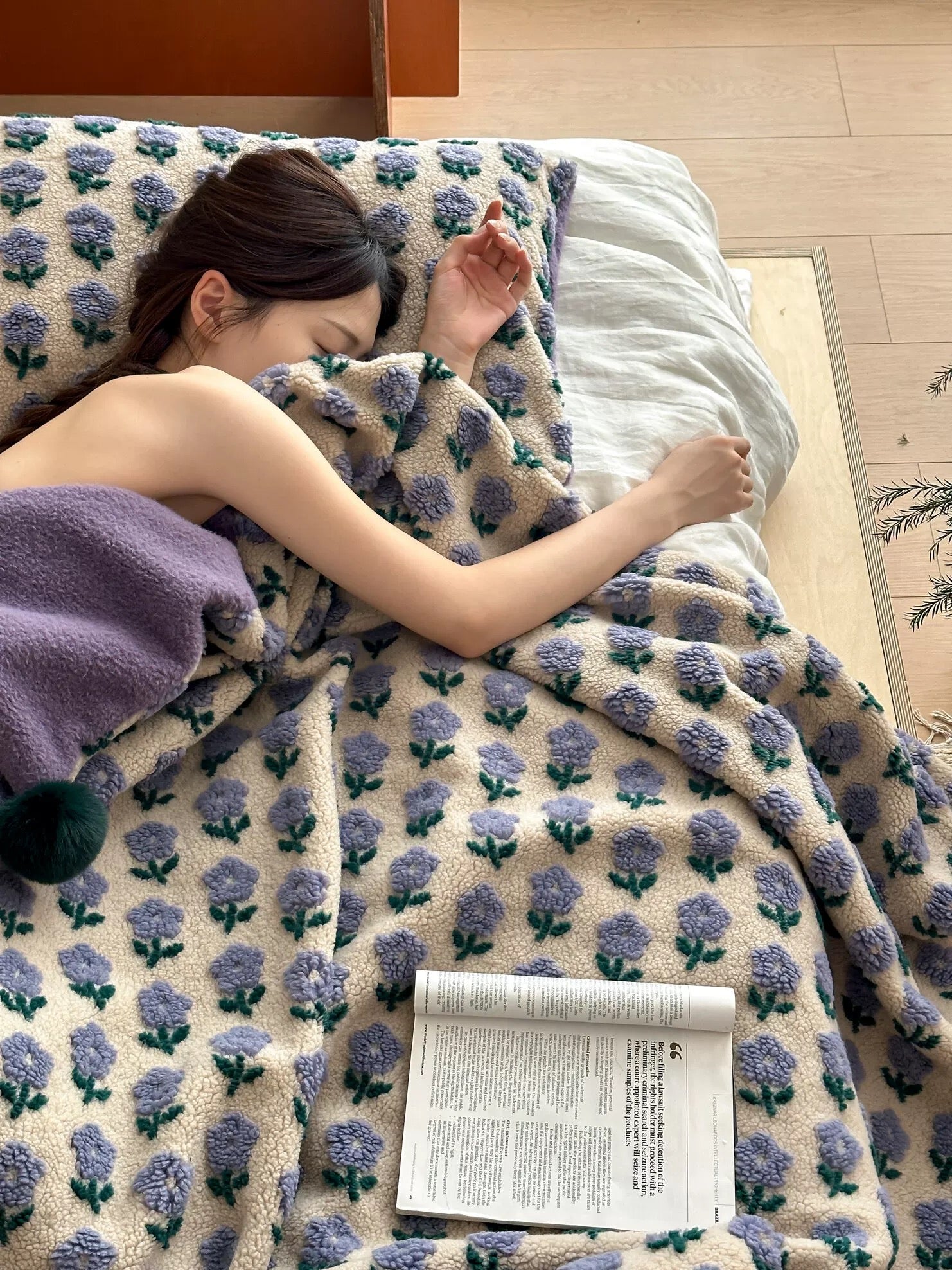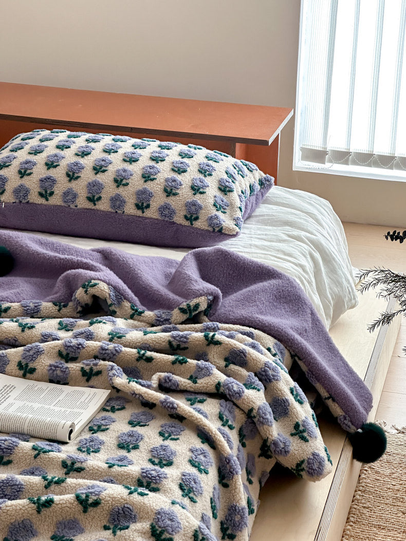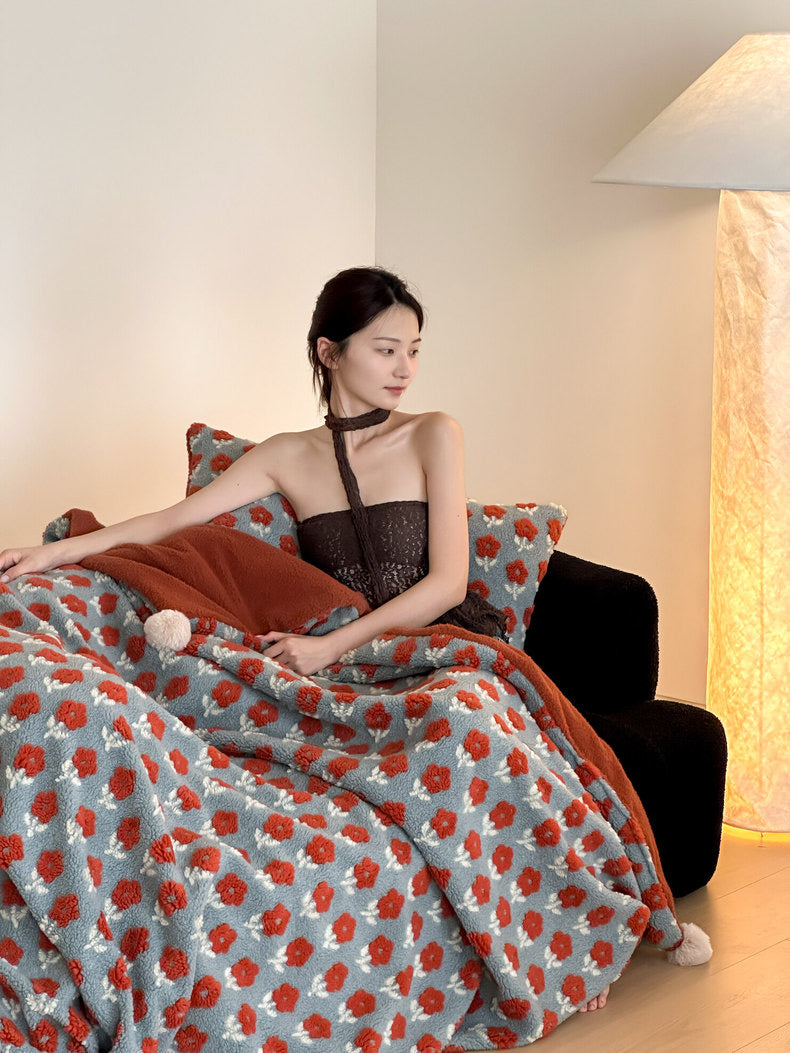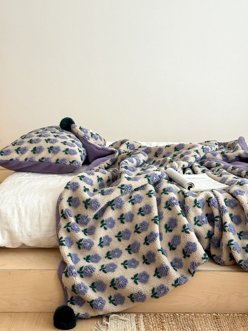 ふんわりと浮かび上がる花柄が目を引く、やさしい印象のブランケット。