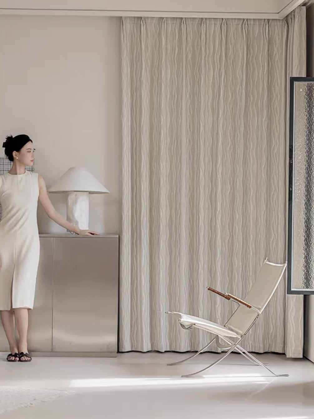 カーテンがふと揺れるたび、水面のさざ波のような表情が広がり、お部屋にそっと生命感を添えます。