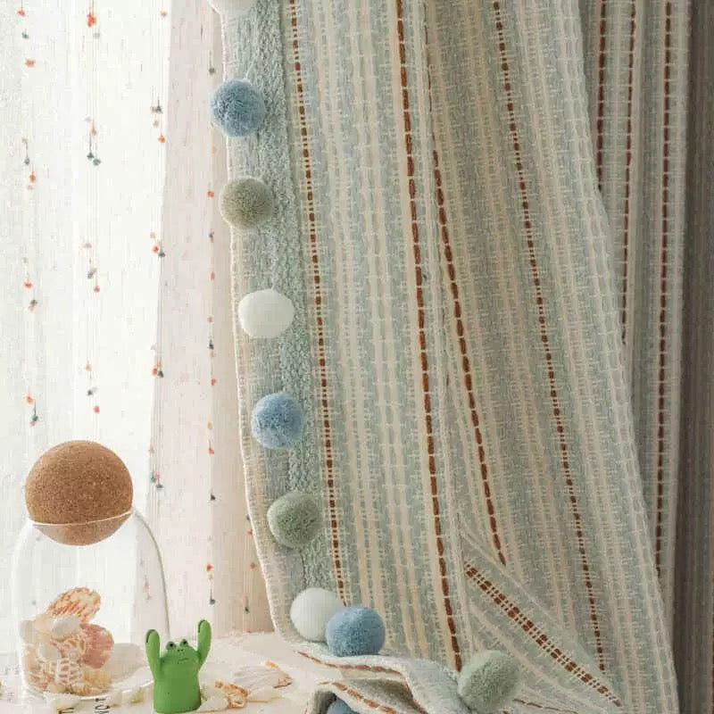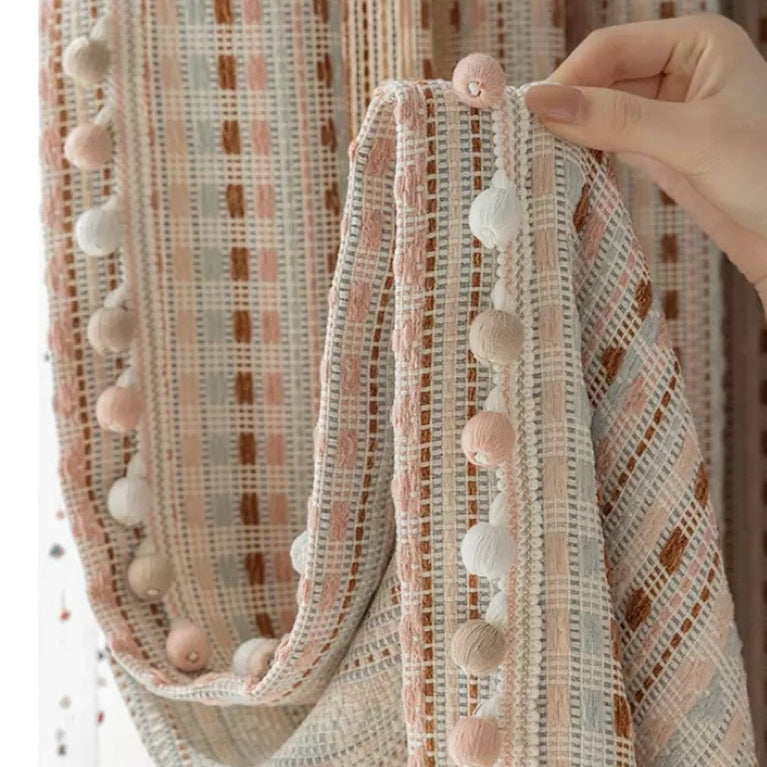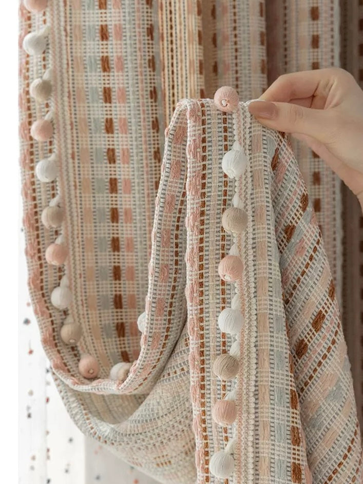 こちらのカーテンではサイズ・サイドのポンポン装飾オーダーが可能です。ご希望の 商品名+仕様【Contact Us】フォームよりご連絡くださいませ。
