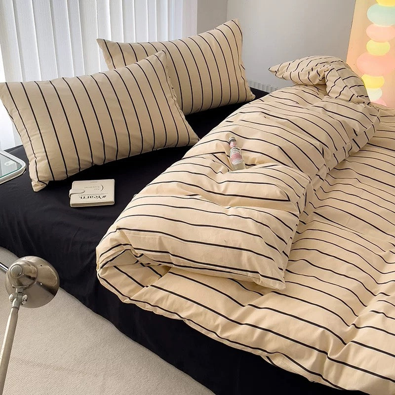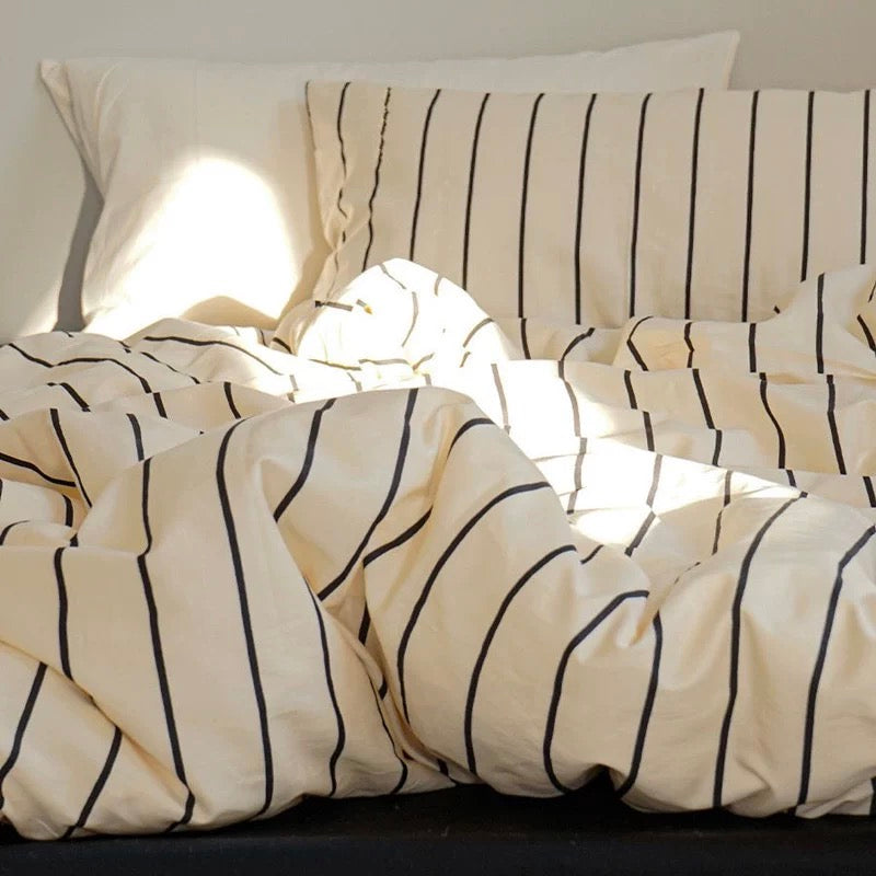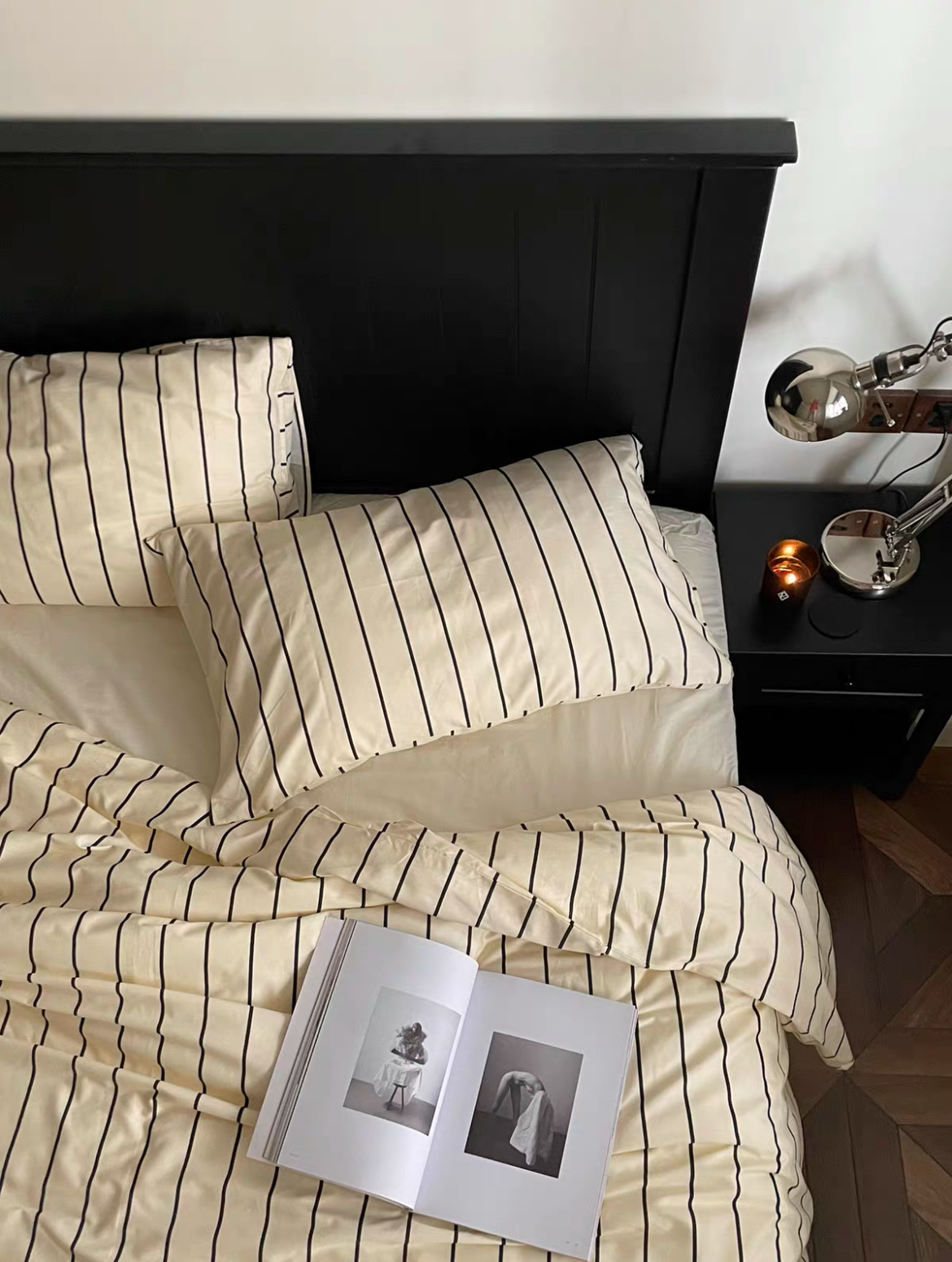 上質なコットン素材に、洗練されたブラックストライプをあしらったエレガントな寝具カバーセット。